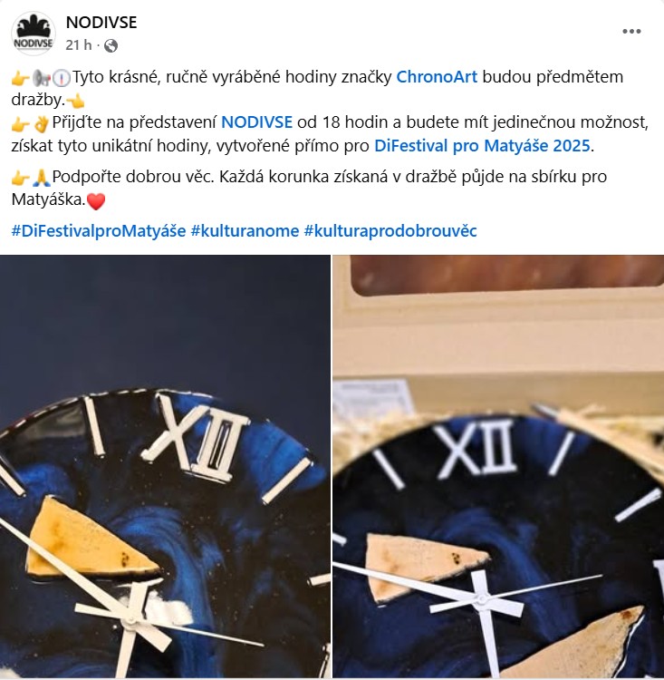 "Moje hodiny tikaly s nadšením pro NODIVSE! Mám radost, že jeden z mých kousků mohl být součástí charitativní dražby, kde šel celý výtěžek na podporu malého bojovníka Toníka. Na těchto hodinách se neukazuje jen čas, ale i to, kolik srdcí má ochotnický spolek a všichni, kdo přišli přispět. Takže díky vám všem, co jste dražili. A NODIVSE? Vy jste opravdoví hrdinové! Každou vteřinu."